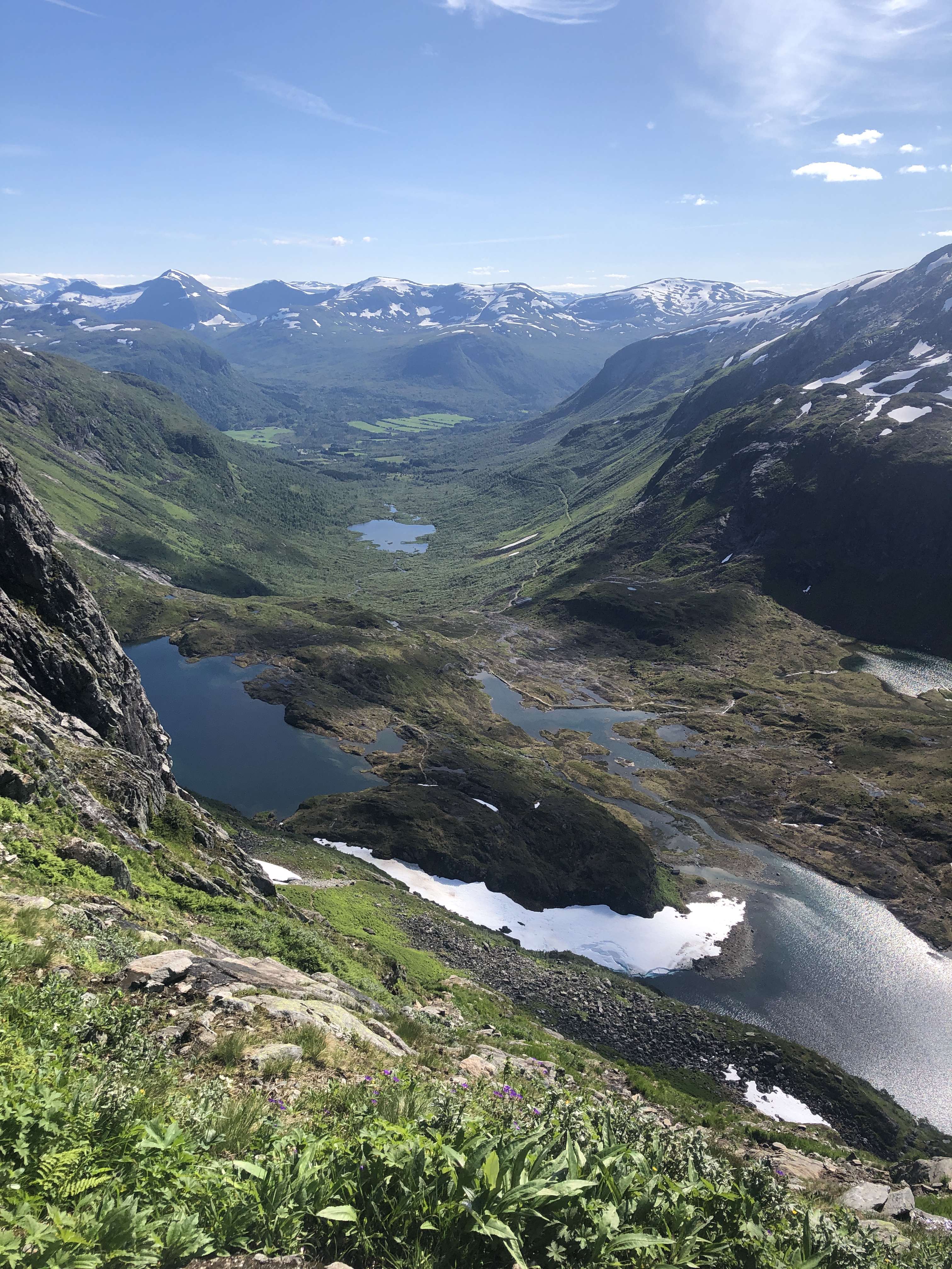The summit of Hornindalsrokken is steep and exposed. After reaching the top, the route continues briefly along the ridge before a steep downhill section begins. The terrain then levels out somewhat as you descend into Kjellstaddalen, traversing alpine terrain and rocky slabs.